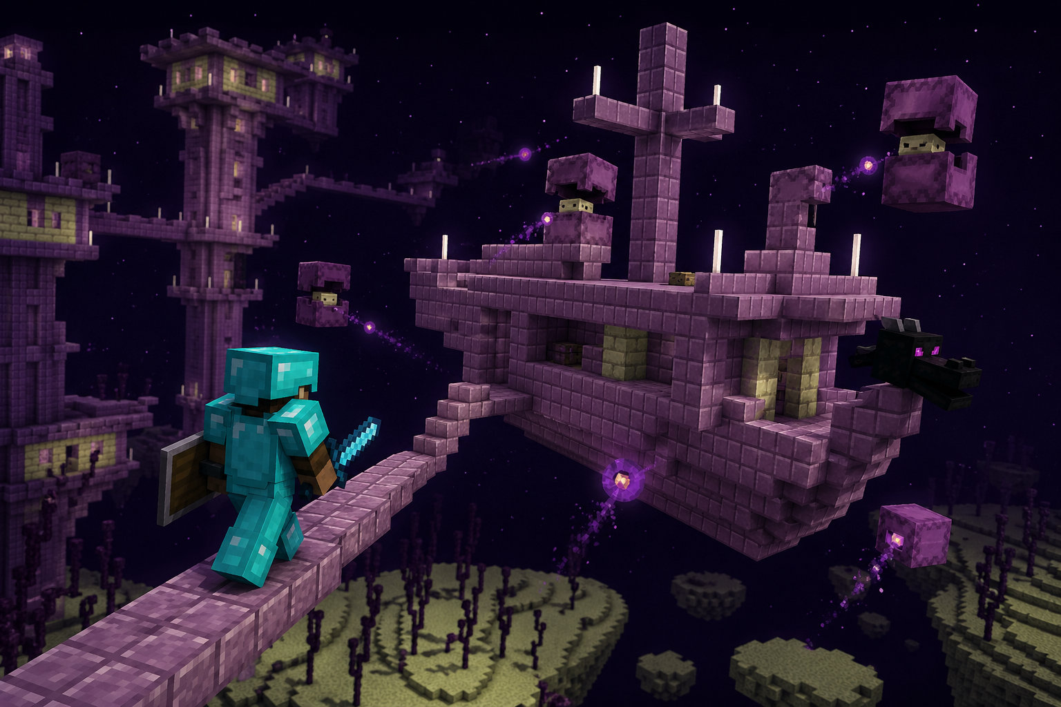 It is made from the same general block palette as End Cities, including purpur blocks and end stone bricks. The ship floats in the sky and usually appears near a bridge extending from an End City.